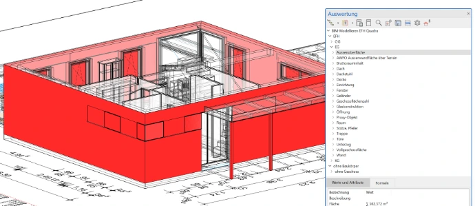 Die Mengenauswertung berücksichtigt automatisch Übermessungsregeln nach VOB und zeigt Dir alle Mengen in nachvollziehbaren Teilflächen direkt am Modell.