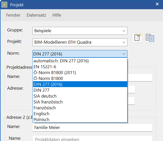 Schon beim Anlegen des Projektes steht Dir die Auswahl der anzuwendenden Norm zur Verfügung. Das hat z.B. Auswirkungen auf die Nutzflächen bei der Raumzuweisung.